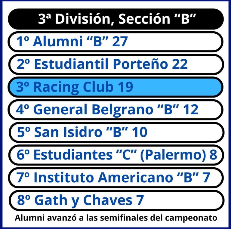 - Racing trepa al tercer puesto a cuatro fechas del final. Las chances de ganar su sección y avanzar a las semifinales del campeonato son pocas, ya que Estudiantil Porteño (jugó un partido más) le lleva 4 puntos y Alumni “B” le lleva 2, pero tiene un partido menos que Racing.