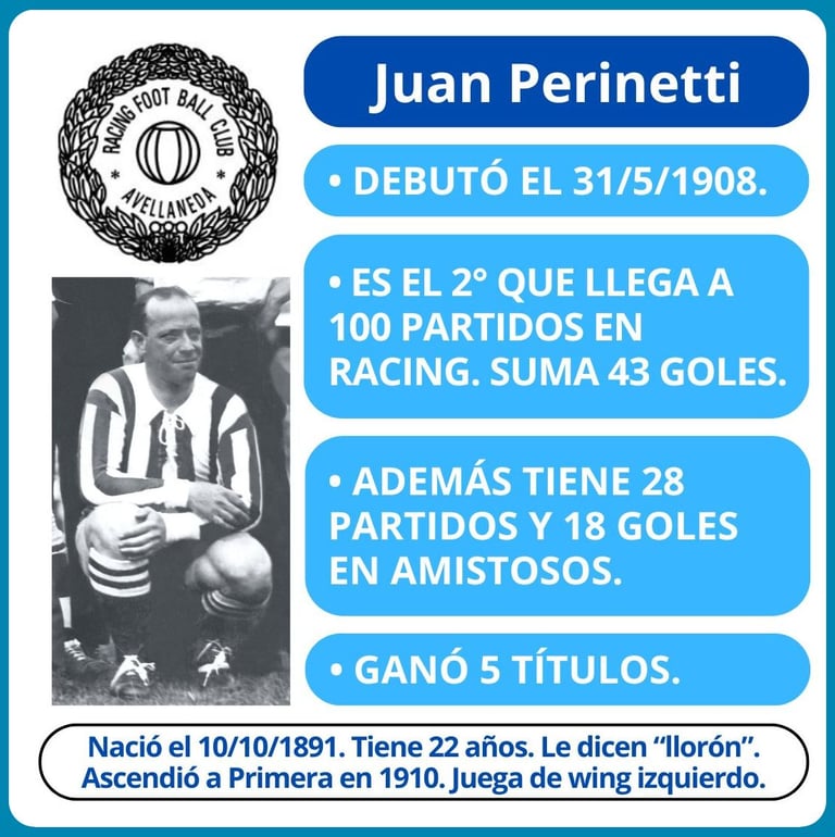 - Juan Nelusco Perinetti llega a 100 partidos en Racing, en los que marcó 41 goles.