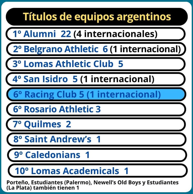 - Y es el 6° título oficial de su historia. Racing se convierte en uno de los tres equipos más campeones, junto a Alumni (22) y Belgrano Athletic (6).