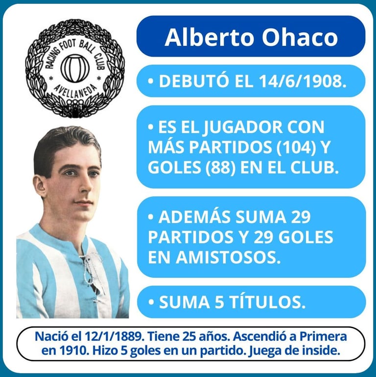 - Alberto Bernardino Ohaco es el primero en llegar a 100 goles en Racing: suma 101 en 113 partidos.