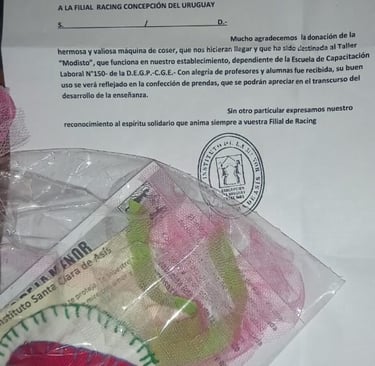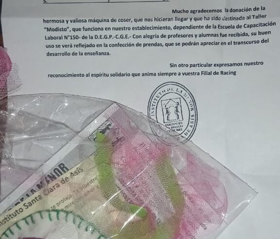 La Filial ha donado una Máquina al Instituto “Santa Clara de Asís” como indica la nota de agradecimiento.